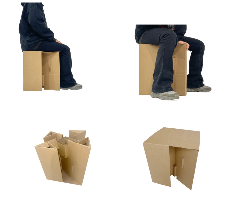 作品主体本身仅用一张厚度约3-4mm的瓦楞纸板折成,运用的是纸质家具设计中常见的折插原理,可以用切割后的材料快速搭建一个方便即时使用的凳子。为了更加贴合可持续设计的主题,内部使用的卡扣结构使用的也是主体切割完成后所剩余的材料,尽可能达到材料更高的利用率。因此作品名称既是点明设计的产品,亦是表明了它所使用的材料数量。凳子的成品有供给成人与儿童使用的不同规格,整体造型偏向方形简洁,既可以在家庭环境中使用,也可以在办公区域内使用。