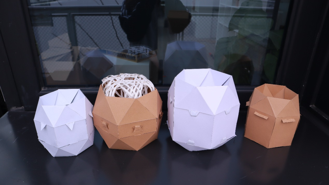 我们组本次的作品围绕三棱柱为主题,思考包括包装,桌椅,箱子盒子等容器。由于三棱柱本身具有的承载性和支撑性的特点,我们将模块化的理念贯彻其中,从单一模块变形到一个桌子,椅子或是适合收纳的六棱柱容器。其中,作为椅子的内容是我们本次最重要的实验作品,他的承载性和结构的巧思都最大程度的展现了对于模块三棱柱的思考性。
