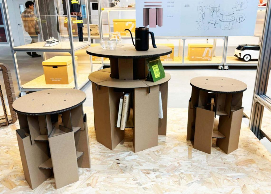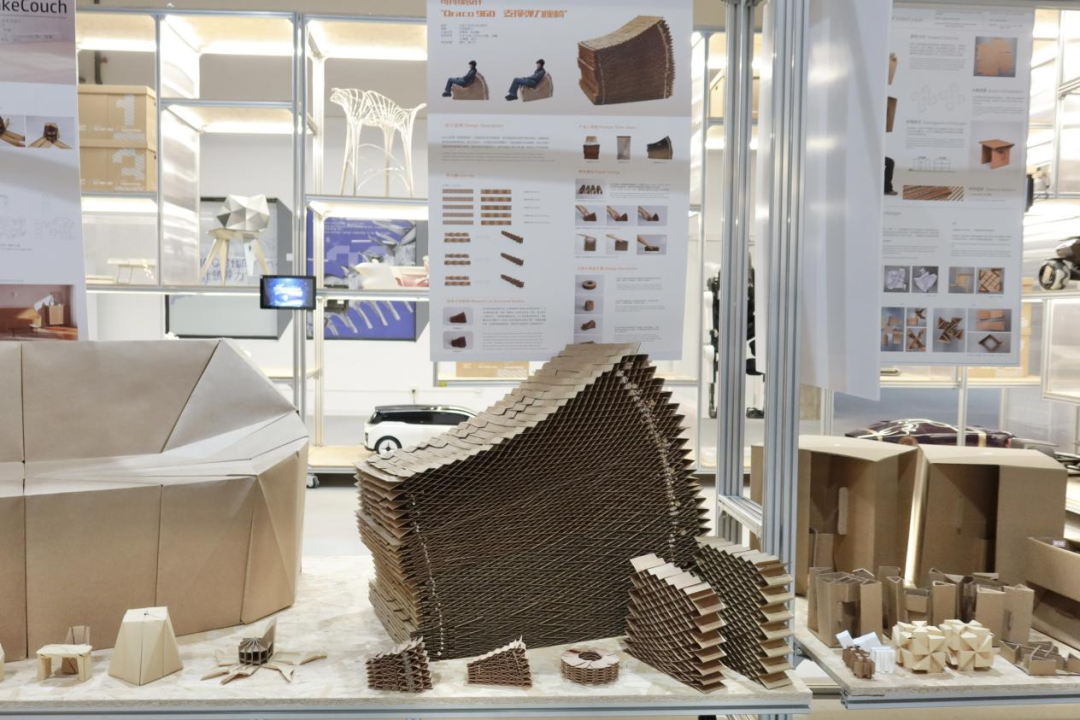 X-A FusionBox 插盒茶几利用折插、拼插的结构原理,以展览后的废纸箱做内部支撑、整块纸板折叠成盒子体块拼插而成。部分的回收材料、可组合性和可多次展开复原,最大限度体现可持续的理念。