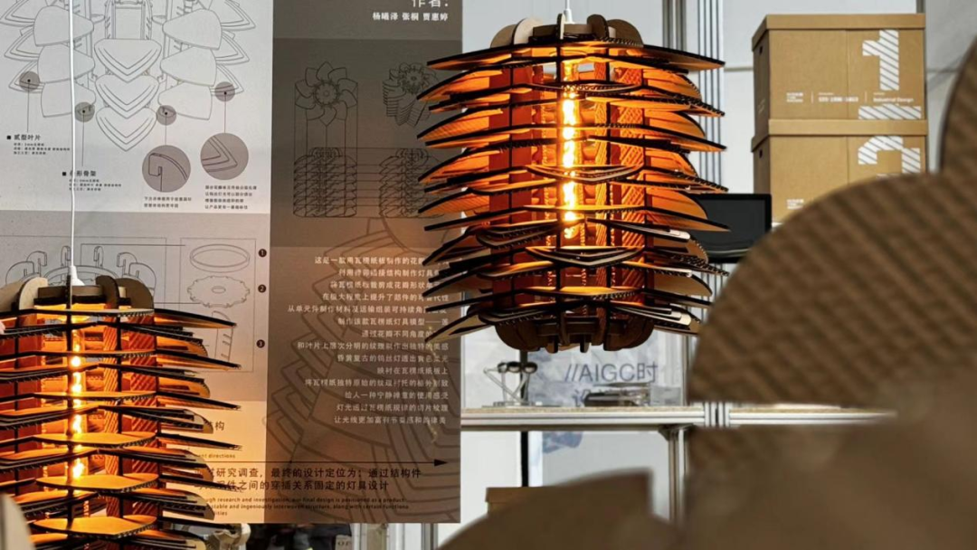 这是一款用瓦楞纸板制作的花瓣形灯具,利用榫卯插接结构制作灯具骨架,将瓦楞纸板裁剪成花瓣形状单元片。在极大程度上提升了部件的可替代性。从单元件制作材料及运输组装可持续角度出发,制作该款瓦楞纸灯具模型——莲。通过花瓣不同角度的穿插和叶片上层次分明的纹理制作出独特的美感,昏黄复古的钨丝灯透出黄色柔光。映衬在瓦楞纸纸板上,将瓦楞纸独特原始的纹理衬托的格外别致,给人一种宁静禅意的使用感受。灯光透过瓦楞纸规律的切片纹理,让光线更加富有节奏感和韵律美。