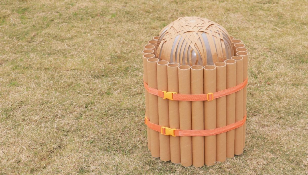 将纸编和气球相结合制成坐垫,提供了一个舒适的坐感体验。底部座椅选择耐用、舒适且稳固的圆管材料,并确保坐垫与底部贴合,防止滑动。坐垫使用环保的牛皮纸作为编织材料,既具备柔软性又环保可持续。坐垫内部留有空余空间以放置充气球,充气球的充气量可根据需要进行调整。使用时,确保底部支撑体的稳固性,并根据个人喜好和舒适度对充气球的气体量进行调整。气球选用承重性较高的软胶材料气球,可以承重一个成年人的体重。在使用完毕后,可以将坐垫和底部支撑体分开存放。圆管周围采取两根捆绑带固定圆管,以确保坐椅稳固,并防止使用时圆管向外撑开。最终通过多种材料与纸制品结合产出一款坐具。